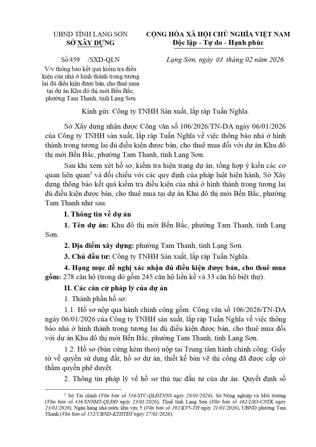 Thông báo nhà ở đủ điều kiện nhà ở hình thành trong tương lai được bán, cho thuê mua tại dự án tại dự án Khu đô thị mới Bến Bắc, phường Tam Thanh, tỉnh Lạng Sơn theo Văn bản số 459/SXD-QLN ngày 03/2/2026 của Sở xây dựng tỉnh Lạng Sơn.